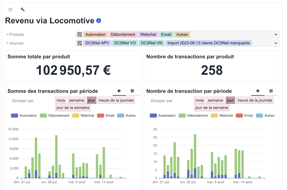 Rendez-vous dans l’onglet Reporting puis Tableau de bord pour suivre les revenus générés via Locomotive. Vous pouvez alors suivre les factures émises par source (Scénario automatique, Webchat, Débordement, etc.) et sur la période souhaitée.