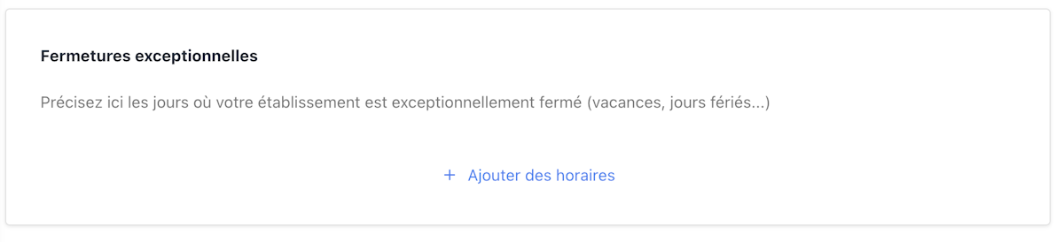 Pour ce faire, rendez-vous sur Paramètres, puis Horaires d’ouverture et ajouter une fermeture exceptionnelle en cliquant sur Ajouter des horaires. Vous pourrez prévenir de votre fermeture, donner votre date de réouverture et souhaitez tous vos vœux à vos clients.