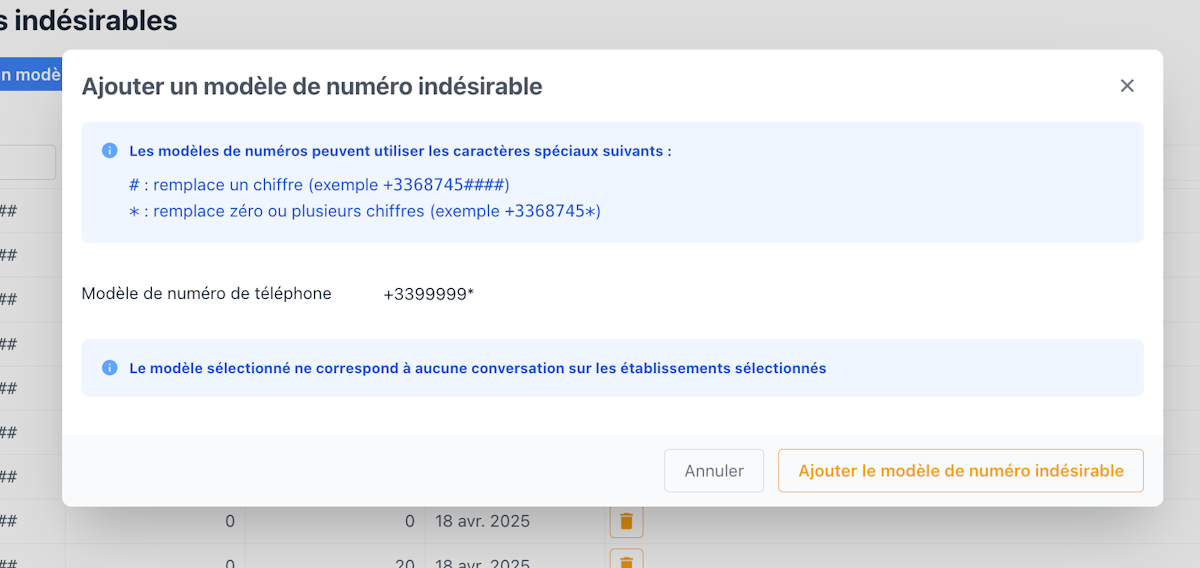Enfin, vous avez aussi la possibilité d’ajouter vos propres règles pour bloquer des plages de numéros. Pour ce faire, cliquez sur ajouter un modèle de numéro puis taper le début de numéro souhaité en terminant par *.
